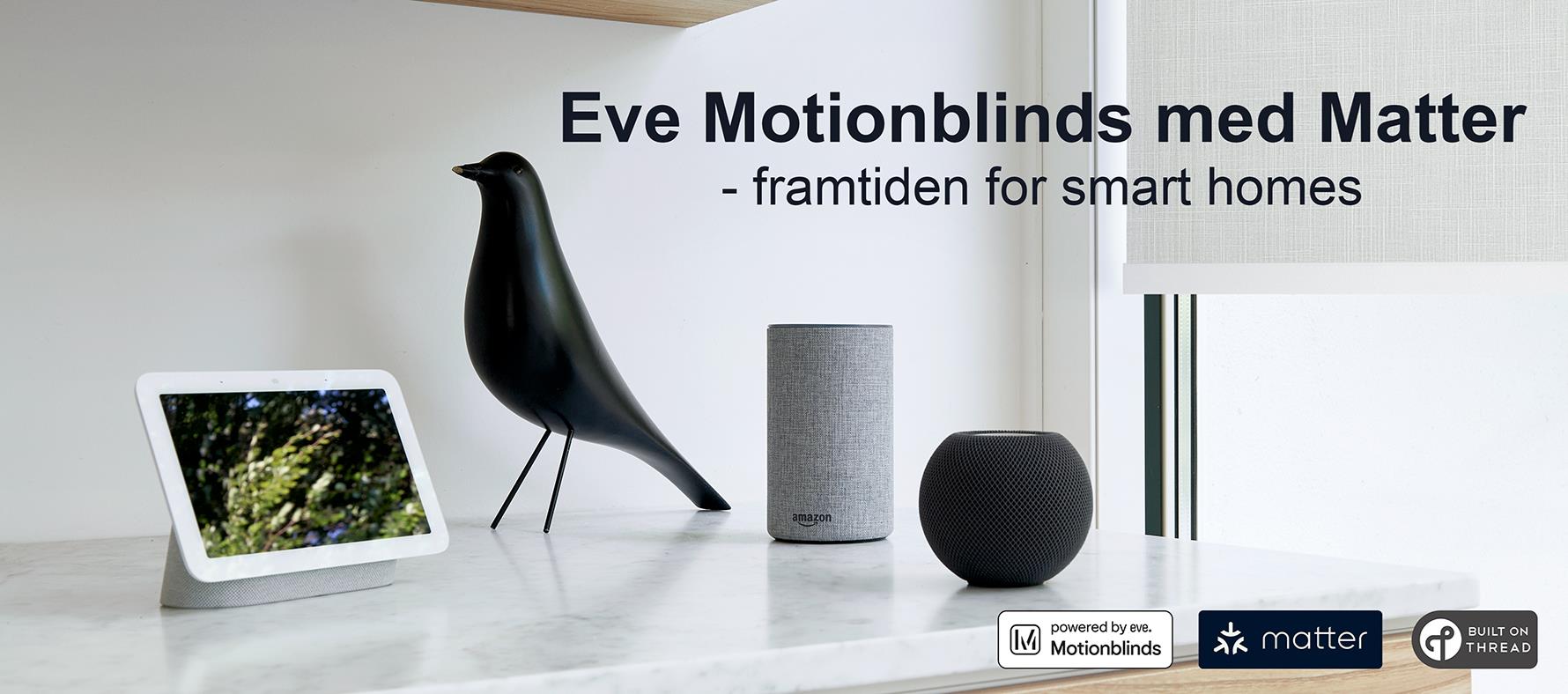 Alle Matter-enheder fungerer bedst, når de kommunikerer via Thread. Threads teknologi gør dit hjem mere responsivt og robust og øger rækkevidden. For at styre dit Eve Motionblinds rullegardin med Matter, skal du bruge en smart home hub med Thread and Matter fra det smart home-system du vælger. Uanset om det er Apple Home, Samsung SmartThings, Amazon Alexa eller Google Home, har hvert system et udvalg af hubs, der understøtter både Matter og Thread i den samme enhed.