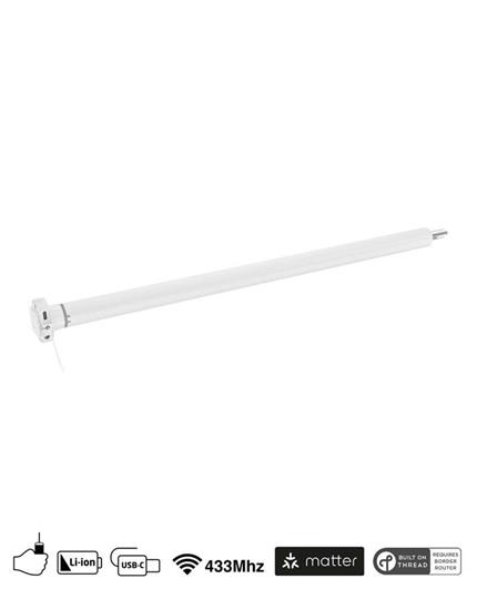 Betjening med fjernbetjening via radio, app/stemmestyring via et Smart Home-system, fx Apple Home, Google Home, Amazon Alexa eller Samsung SmartThings (kræver en Thread border router) eller manuelt med en pull cord. Virker med både Android og iPhone. Indbygget Li-ion batteri, der oplades med et USB-C kabel 1-2 gange om året.