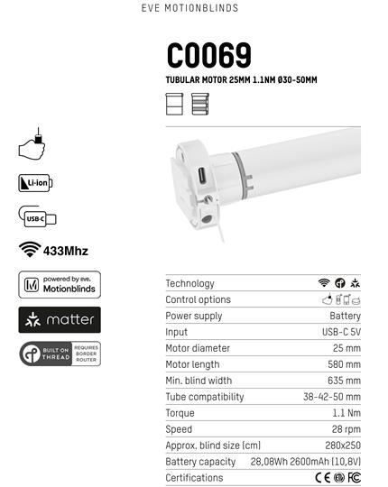 Nyt for 2024 er denne batteridrevne Eve Motionblinds motor med Matter og Thread Det er vores smarteste og nemmeste motor at installere og bruge.
