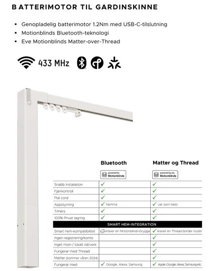 elektrisk-gardin-textbild Med et motoriseret gardin skaber du et energieffektivt, komfortabelt, sikkert og smart hjem. Motoren er batteridrevet og styres via app med Bluetooth eller fjernbetjening med radio, og kan styres sammen med vores elektriske rullegardiner og plisségardiner. Fjernbetjening kan købes separat. Motoren er placeret for enden af ​​skinnen, og du vælger selv hvilken side. Motoren er skjult af gardinet. Batteripakken kan tages ud for opladning med USB-C.