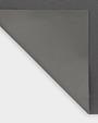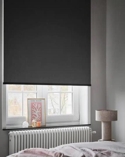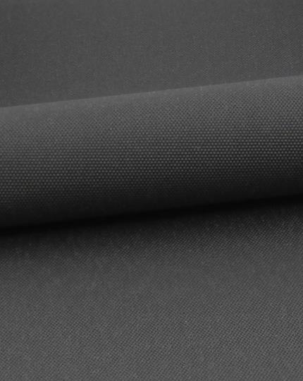 Mørkegrå stof i polyester med en glat overflade. En tynd belægning af akryl på bagsiden af ​​stoffet gør rullegardinet 100% mørklægning. Grå på både for- og bagside.