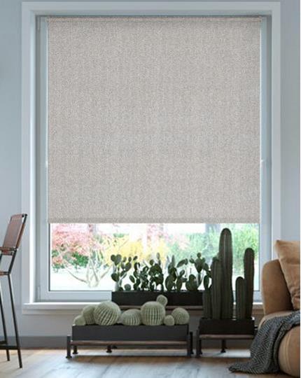 Gråbeige stof med en smuk, grov tekstilstruktur i polyester. Stoffet opfattes som svagt stribet i lodret retning. En tynd belægning af akryl på bagsiden af ​​stoffet gør rullegardinet 100% mørklægning. Bagsiden er hvid for den bedste refleksion af varme.