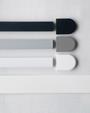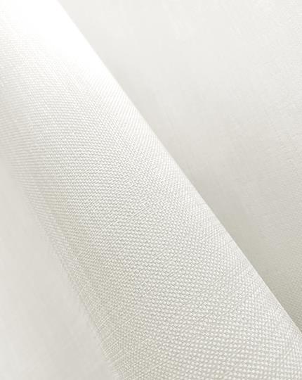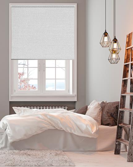 Off white rullegardin med en synlig vævet struktur som på en panamahatt. Tekstilet er lavet af polyester og har en tynd belægning af akryl på stoffets bagside hvilket gør blinden 100% lystæt. Bagsiden er hvid for den bedste refleksion af varme.