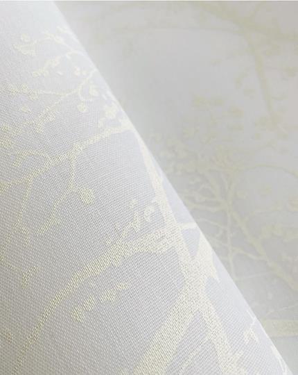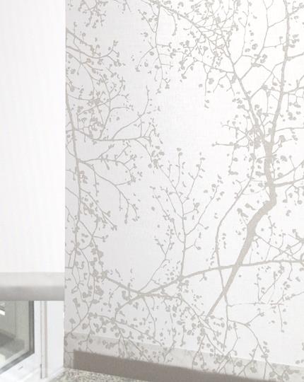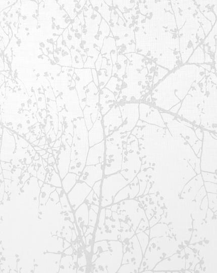 Hvidt rullegardin i polyester med påtrykt hvidt mønster af grene. Mønsteret fremstår forskelligt afhængigt af lysets indfald og styrke. Slipper et behageligt lys ind, men skærmer for indkig og direkte sollys.