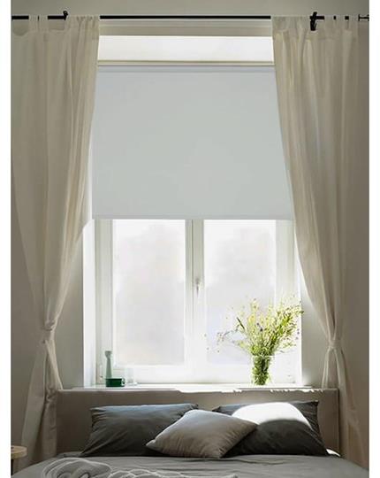 Dette er vores standard mørklægningsstof. Et lysegråt, glat stof i polyester med en tynd belægning af akryl på bagsiden af ​​stoffet, som gør rullegardinet 100% lystæt. Grå på både for- og bagside.